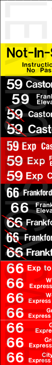 | This mylar front rollsign was designed for one of SEPTA's AM General trackless trolleys (or trolley buses). The black exposures are for local services where the red exposures are for express services. Route numbers and destinations with a dash through the number are destinations that are short of a full length run of the route. The original sign is dated October 22, 1979, but with the addition of the brighter red express exposures, dates it to March 18, 1983. The sign has 40 exposures. |