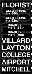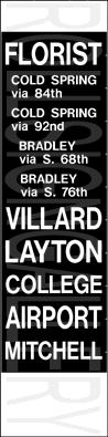 | These mylar sections were designed as inserts for existing signs. The one on the left was for a front sign. The one above and to the right were for side signs. The ones to the left and right have no printed date or manufacturer, 10 exposures each, and all three inserts were in "mint" condition, having never been in a bus |
