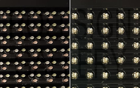 | As noted above, early Chroma signs had the full color area made up of three separate LEDs for each pixel, one each of red, green and blue (left side). Newer Chroma signs had those three colors within a single LED body (right side). |