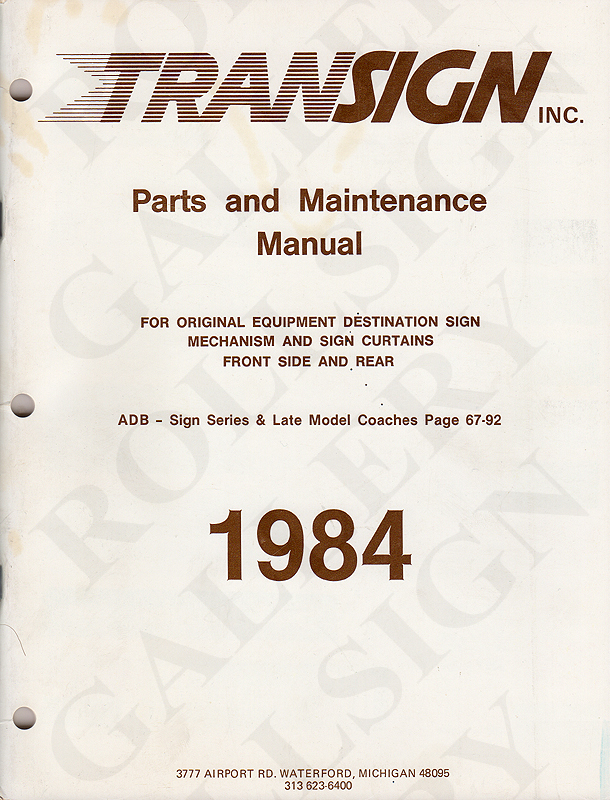 | This parts and schematics manual lists all the available sign sets, frames and boxes that were produced as of the year 1984, including some discontinued models, and a section near the back that depicts late model transit sign frames and run number boxes. |